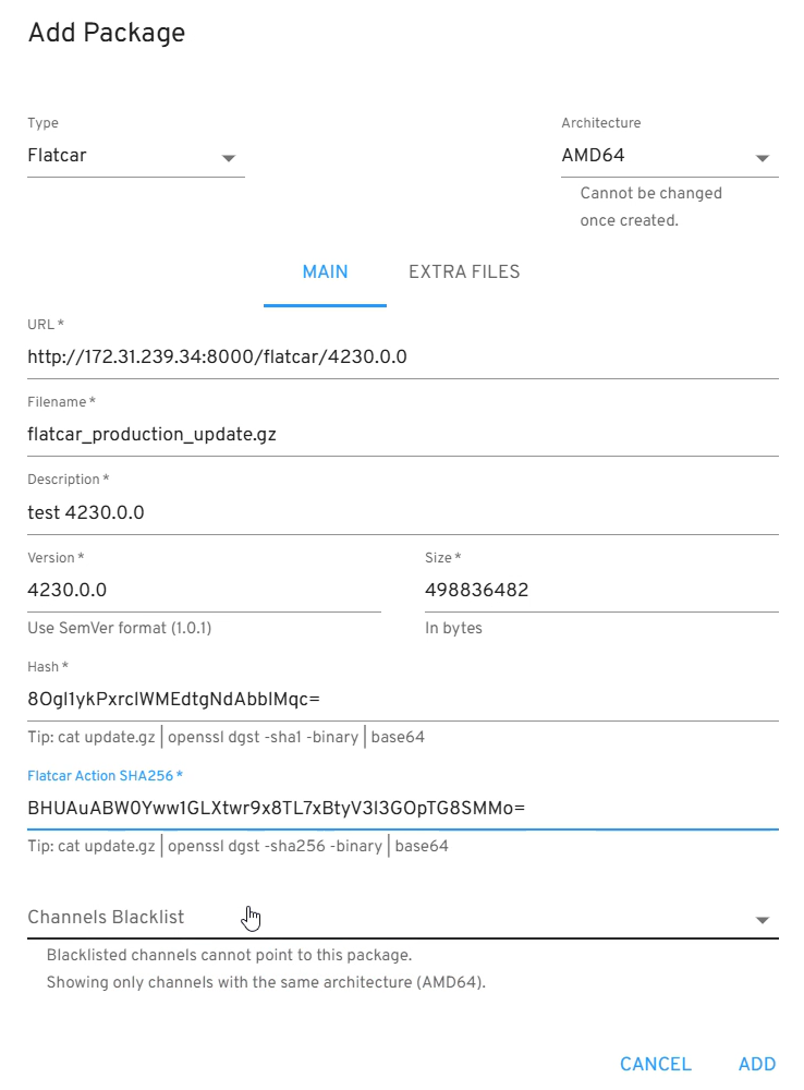 For example, if your ip address is 172.31.239.34, and if the dedicated directory to store the packages is /tmp/flatcar/, while the package is in the subdir /tmp/flatcar/4230.0.0, you start nebraska with the following params: -host-flatcar-packages=true, -flatcar-packages-path=/tmp/flatcar, and -nebraska-url=http://172.31.239.34:8000, then the filled form should look like: